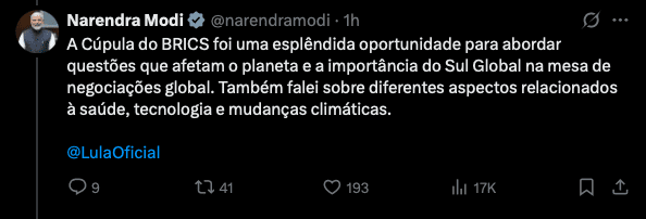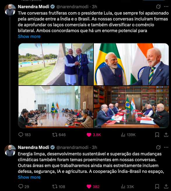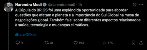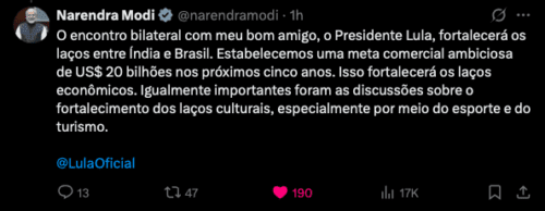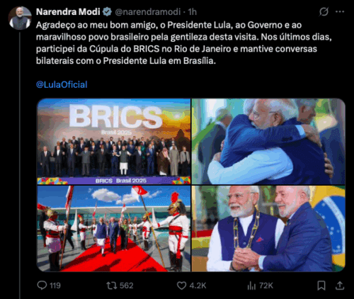 Depois das reuniões, Narendra Modi concluiu sua visita com as seguintes palavras em sua conta oficial no X: